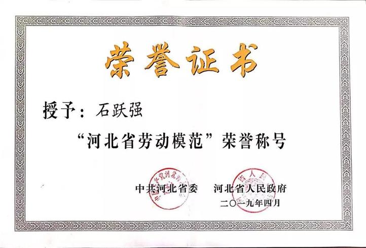 王啟良副主席在迎賓大廳宣讀了中共河北省委、河北省人民政府對石躍強同志的表彰決定,并與石總持獎章和證書在普陽辦公樓前廳合影留念。