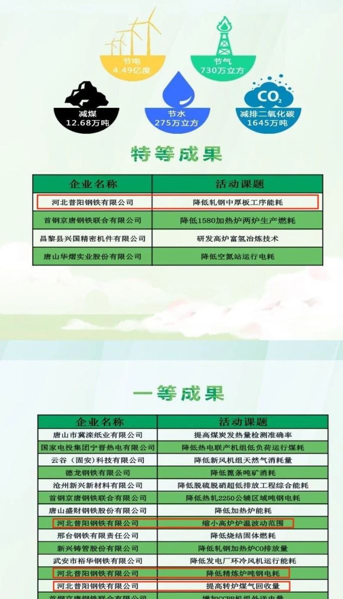 ? ? ? 本次征集活動(dòng),堅(jiān)持全員參與、注重實(shí)效、促進(jìn)交流的原則,采用自主申報(bào)、推薦等方式,共征集業(yè)績(jī)成果169項(xiàng),主要涉及節(jié)能、節(jié)水、二氧化碳和重點(diǎn)污染物減排等方面,經(jīng)行業(yè)專家評(píng)審,評(píng)出特等成果4項(xiàng),一等成果30項(xiàng),二等成果45項(xiàng)。其中,河北普陽鋼鐵有限公司(以下簡(jiǎn)稱“普陽”)提交的降低軋鋼中厚板工序能耗課題獲評(píng)特等成果,縮小高爐爐溫波動(dòng)范圍、降低精煉爐噸鋼電耗以及提高轉(zhuǎn)爐煤氣回收量3項(xiàng)課題被評(píng)為一等成果。據(jù)不完全統(tǒng)計(jì),本次評(píng)定的成果應(yīng)用經(jīng)濟(jì)效益可達(dá)3.63億元/年。年節(jié)電4.49億kWh、節(jié)氣730萬m3、減煤12.68萬t、壓采地下水275萬m3、減排CO21645萬噸,大幅削減重點(diǎn)污染物排放。