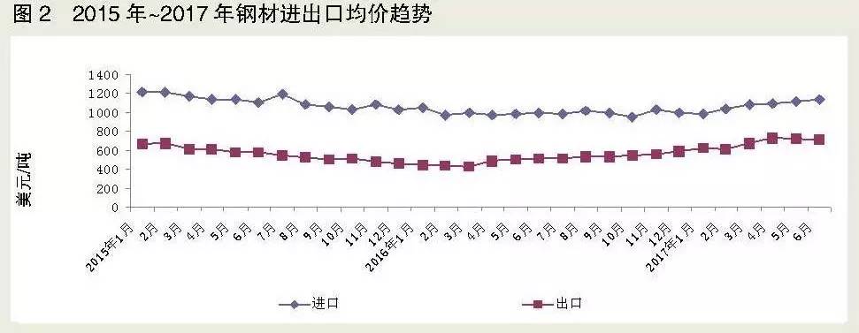 6月份,我國鋼材進口均價為1142.21美元/噸,環(huán)比上漲24.25美元/噸,提高2.17%;1月~6月份,我國鋼材進口均價為1078.18美元/噸,同比上漲83.11美元/噸,提高8.35%。6月份,我國鋼材出口均價為709.34美元/噸,環(huán)比下跌13.40美元/噸,降低1.85%;1月~6月份,我國鋼材出口均價為680.33美元/噸,同比上漲213.60美元/噸,提高45.77%。(見圖2)