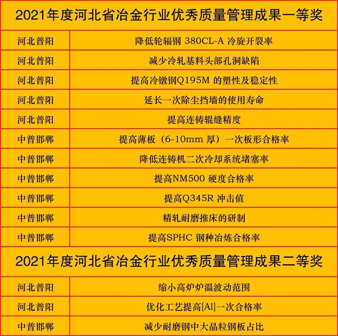 自2012年起,河北普陽鋼鐵集團(tuán)導(dǎo)入QC(質(zhì)量控制的英文縮寫)管理方法。截至目前,共94項(xiàng)成果在河北省冶金行業(yè)質(zhì)量管理優(yōu)秀成果發(fā)布會獲獎,其中獲特等獎3項(xiàng)(2017年設(shè)立),一等獎74項(xiàng),二等獎17項(xiàng),并連續(xù)多年榮獲“河北省冶金行業(yè)質(zhì)量管理小組活動優(yōu)秀企業(yè)”的榮譽(yù)稱號。