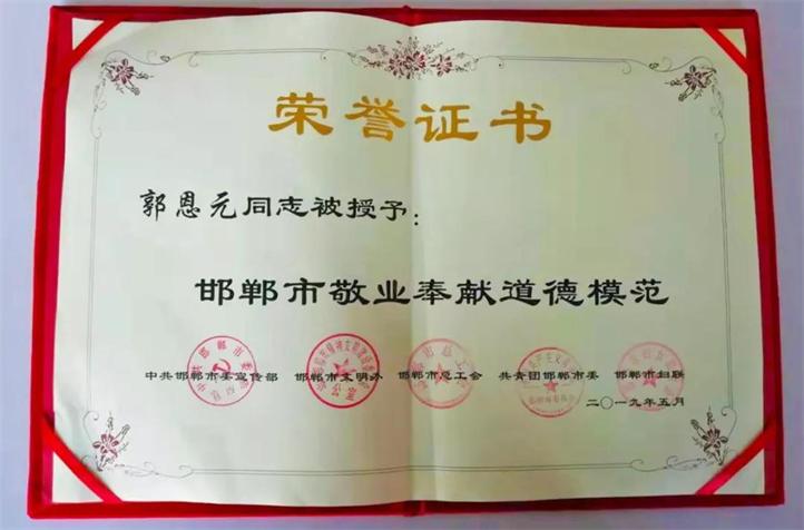 近日,由邯鄲市委宣傳部、市文明辦、市總工會(huì)、團(tuán)市委、市婦聯(lián)聯(lián)合舉辦的“邯鄲市第七屆道德模范頒獎(jiǎng)典禮暨2019年度新時(shí)代好少年先進(jìn)事跡發(fā)布會(huì)”,在市廣播電視臺(tái)演播大廳舉行。會(huì)議表彰了對(duì)推進(jìn)全市精神文明建設(shè)做出突出貢獻(xiàn)的企事業(yè)單位和個(gè)人,全國十大杰出企業(yè)家、全國鋼鐵工業(yè)勞動(dòng)模范、普陽鋼鐵集團(tuán)黨委書記、董事長郭恩元榮獲“邯鄲市敬業(yè)奉獻(xiàn)道德模范”榮譽(yù)稱號(hào)。