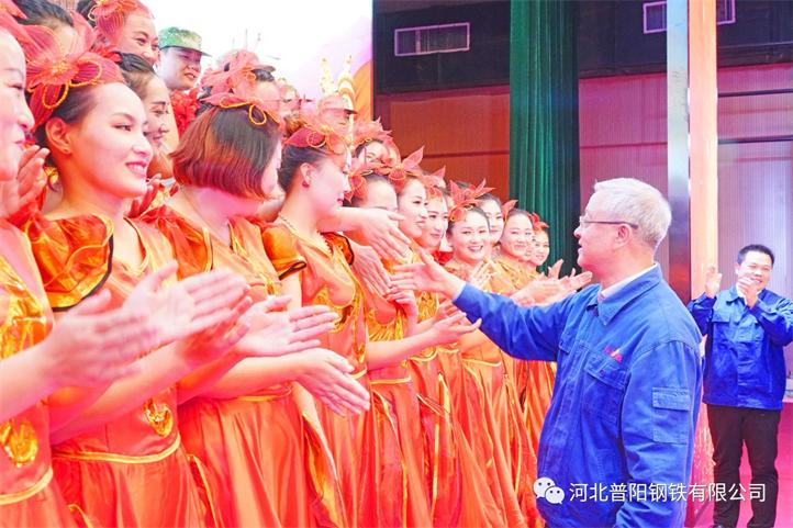 由普陽人自編自演的歌伴舞、啞劇、小品、朗誦等節(jié)目,通過演員們激情的表演,表現(xiàn)的淋漓盡致,展現(xiàn)出了社會主義新時代的幸福場景,也表達了普陽人對祖國的熱愛。由全體演職人員共同高歌的《普陽之歌》,把晚會推向了高潮,隨后,陽邑鎮(zhèn)領(lǐng)導(dǎo)和公司領(lǐng)導(dǎo)上臺與演職人員合影,董事長郭恩元與演員們親切握手。