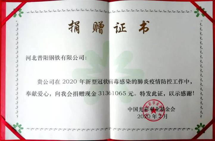 其中,通過中共武安市委統(tǒng)戰(zhàn)部和市工商聯(lián)向中國光彩基金會(huì)捐獻(xiàn)人民幣3136.25萬元(含員工捐款136.25萬元),定向用于武漢地區(qū)的疫情防控工作。為大力支持武安市疫情防控工作,普陽鋼鐵集團(tuán)向武安市第一人民醫(yī)院(康二城煤礦隔離病區(qū))捐獻(xiàn)人民幣600萬元,定向用于采購必備的醫(yī)療物資。